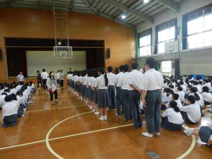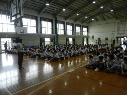 指示の急な変更に静かに対応して,体育館に集まってきました。担当の先生や生活委員長の講評を聞いて,次の避難訓練に活かしていきます。