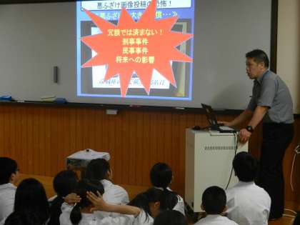 6時間目,1年生は学年集会で「非行防止教室」を実施しました。教育委員会から指導者を招いての学習会でした。SNSなど身近に潜む危険に対して本当にあった事例をもとに話をしてくださいました。最初は事例などのインパクトにいちいち反応していた生徒たちでしたが,だんだん事の深刻さが理解できてきたのか真剣に聞き入るようになっていました。明日からの自分の生活にしっかりと活かしていって下さい。