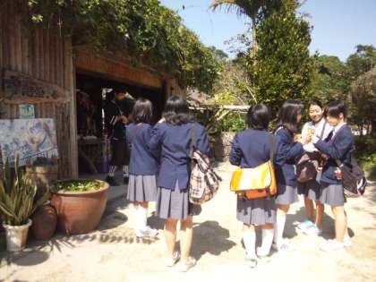 修学旅行団は,沖縄を満喫しているようです。琉球村にて,道ジュネー鑑賞・村内見学・シーサーの絵付けを行い,昼食を取りました。まもなく,多くの生徒が楽しみにしている「美ら海水族館」に到着すると思います。【ジンベエザメの大きさに驚くなよ!!!】