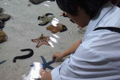 美ら海水族館の見学が終わり,ナゴ・パイナップルパークに向かっています。さすが世界で2番目の規模を誇る水族館だけあって,生徒たちには好評のようでした。きっといい経験になったでしょう。【少し,海星を引っ張り過ぎていない…?】