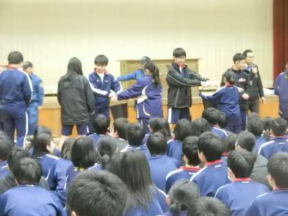 体育館に避難(集合)してからは、グランドでの体験ができず、縮小版にはなりましたが、消防団の方々の指導で、“消火器の使い方”、“応急手当の仕方”、“バケツリレーの練習”に取り組みました。
