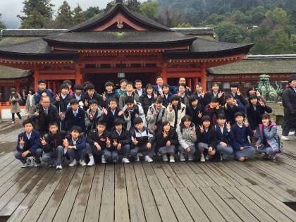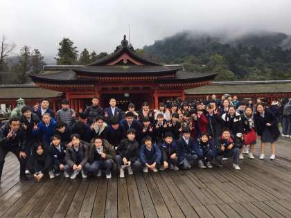 厳島神社をバックに、クラス写真です。