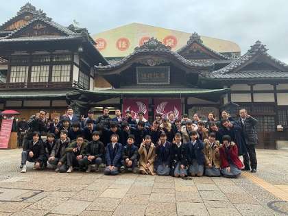 道後について温泉街を散策、自由行動になる前に、クラスごとに“ハイ、チーズ!”