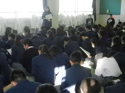 1年生では、来週の水曜日に観世会館にでかけての伝統公演見学のための事前学習を行いました。京都に受け継がれてきた芸能の素晴らしさやそれを味わうための基礎を学びつつ、当日見学する「能」の演目“船弁慶”の内容を理解するため、1年の先生たちによる寸劇も披露されました。今日は、事前学習で少し楽しかったですが、当日はしっかりと伝統芸能を味わってきて下さい。
