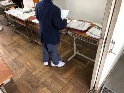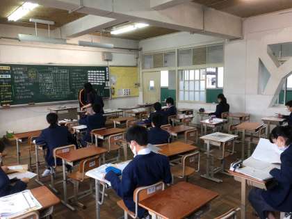 教室では,座席の間隔をあけて活動しています。家庭学習課題の提出とチェック,映像を用いての活動,自主学習課題をしています。静かに集中してできています。
