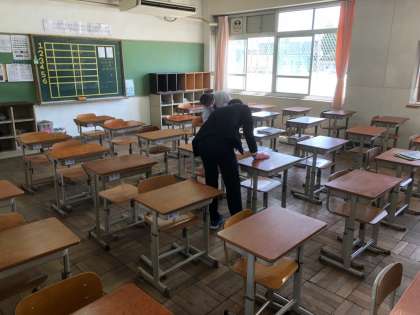皆さんが下校後,教職員で使用した教室を消毒しています。次回の登校日に向けて,準備しています。