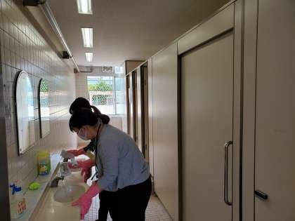 登校日が終わり,生徒の皆さんが下校した後に,教職員で消毒作業を行っています。