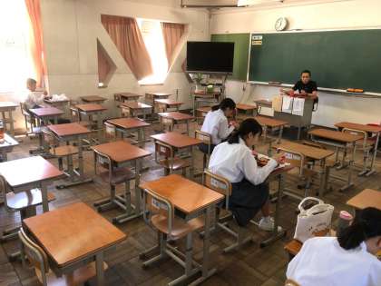 昼食の様子です。給食を申し込んでいる生徒は,各自で配膳室に取りに行って,食べ終わった後は,返却をします。全員で食べられないのは少し寂しいですが,また一歩,通常に向かって前に進んでいます。