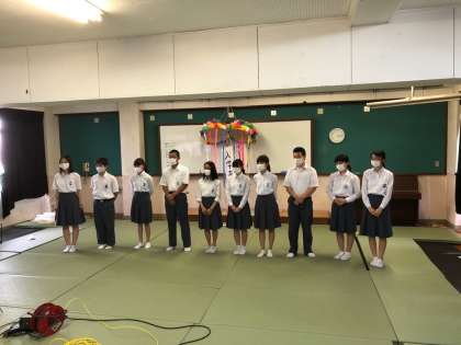 写真は,1年生のあいさつ,くす玉割り,最後に生徒会企画委員が整列してあいさつをしているところです,新入生歓迎会は好評のうちに終了しました。