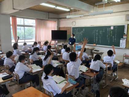 1年生と2年生の理科と国語の授業です。理科では,実験ができないところは,映像やパワーポイントを使って授業をしています。国語では,積極的に手を挙げて,発表をしています。