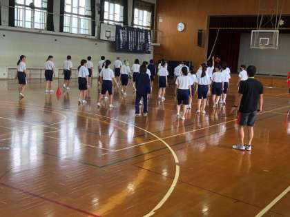 3年生の保健体育の授業です。体育大会で演技する「プロジェクト」の練習をしています。夏休みから各クラスのリーダーが,打ち合わせを重ねてきました。体育大会当日に素晴らしい演技ができるようリーダーを中心に頑張っています。「早く並ぼう」,「さっと動こう」,「しっかりそろえることを意識しよう」など前向きな声が授業の中で聞こえてきます。とても頼もしく感じます。