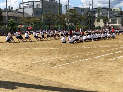 3年生学年種目「綱引き」の様子です。学級ごとに工夫したかけ声にあわせて綱を引いています。