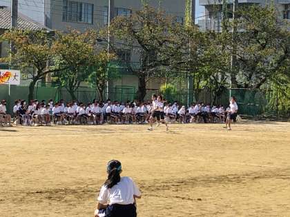 学級対抗リレーの様子です。学級の代表が,力の限り走っています。