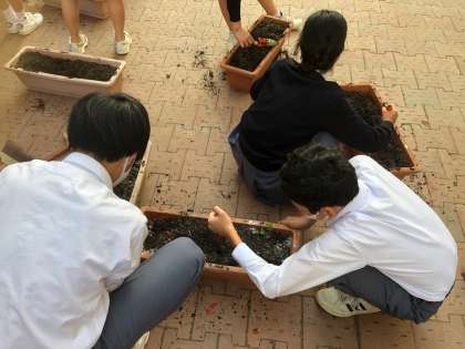 植え替えのための土作りをしているところです。これからの季節にふさわしい花を植えるためにプランターの土を作りました。これまでも,休日にも関わらず,水やりや世話をしばがら大切に育ててきました。