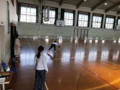 1組の保健体育の授業です。1人がフリスビーを投げて,それをペアの人が,袋でキャッチするゲームです。