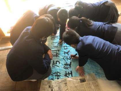 写真は,スローガン作成の様子を第74期スローガンを下ろしたところです。