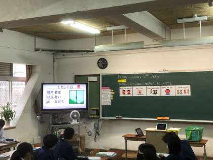1年生英語の授業の様子です。「Can I 〜 ?」,「Can you 〜 ?」を使って,許可を求めたり,依頼をしたりする英文の学習をしています。日常生活の様々な場面を想定し,会話の練習をしていました。