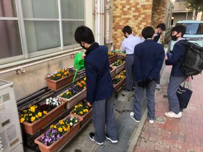 グリーン活動の引き継ぎの様子です。来年度グリーン活動をする1年生に,2年生から活動の引き継ぎをしました。各班ごとに,2年生が1年生にプランター手入れの仕方や水やりの方法などを教えていました。
