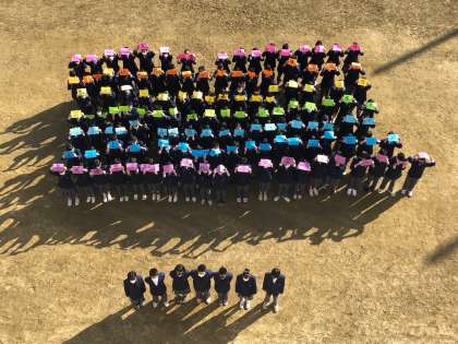 1年生の人文字です。生徒会スローガンの「十人虹色」をイメージして創りました。