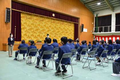 式後の1年生教職員紹介の様子です。学級担任や学年の教職員を新入生と保護者の皆様の前で紹介しました。残念ながら,保護者の皆様の教室への入室は,お控えいただいたので,この場だけでの紹介となりました。