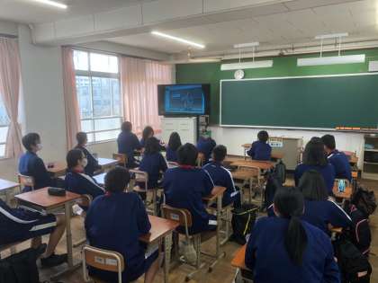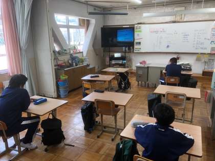 2・3年生は各教室で体育館の様子をテレビで見ています。