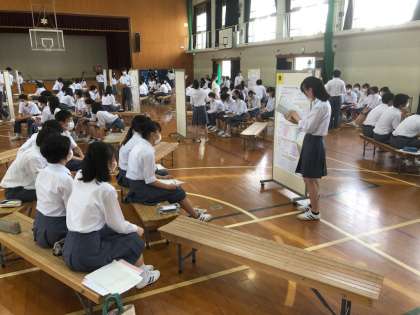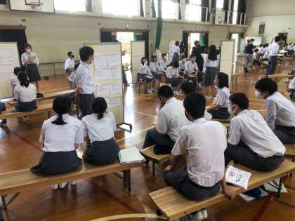 それぞれのブースでは,発表者が,学習の成果を真剣に発表していました。発表者の姿に聞き手の方も,メモを取ったり,聞きたいことやもっと知りたいことを質問したりしていました。今日を迎えるまでは,大変だったようですが,やっていくうちに楽しくなってきたややってみてよかったなどの感想を持っている生徒が多かったようです。