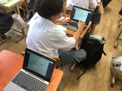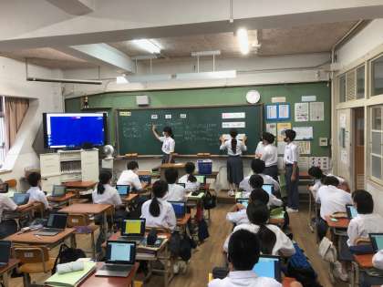1年生の英語の授業の様子です。各班である学習内容を担当し,授業を行っています。聞いている生徒は,タブレットでロイロノートを使って,授業について思ったことや質問を送り,学級でその内容を共有しています。
