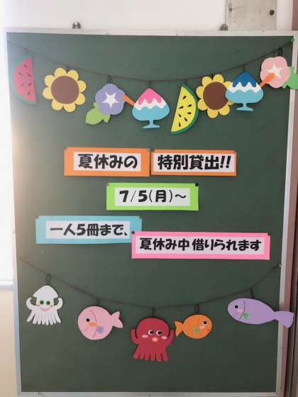 明日から,夏休みに入ります。図書室より夏休み中の特別貸し出しの案内です。一人5冊まで夏休み期間中,借りられます。宿題やスキトガ(探究学習),読書など必要な本があれば借りて下さい。