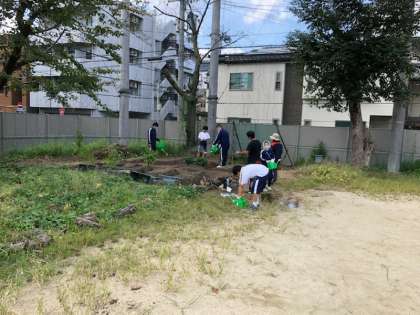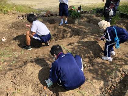 1組栽培活動の様子です。種まきと水やりの様子です。秋のすがすがしい日差しの下,作業をしています。