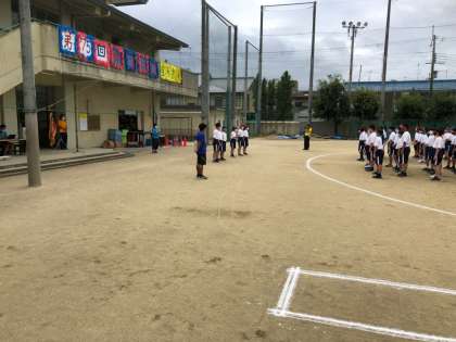 1年生の様子です。開始前のあいさつです。体育委員が進行をしています。準備運動をして,いよいよ競技の開始です。