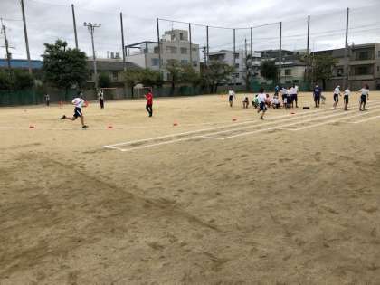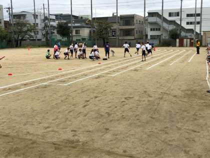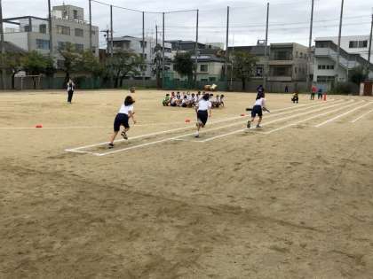 学級対抗リレーの様子です。男女混合でクラス対抗で競います。クラスから選ばれたメンバーが,バトンをつないでいきます。