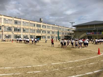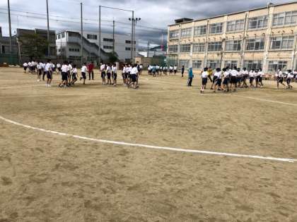2年生学年競技「8の字跳び」です。いかにタイミング良く縄を回すかと跳ぶ人の流れをスムーズにするかが大切です。あとは,焦らないことだと思います。応援席からも「あせらないで」というアドバイスが,聞こえてきました。