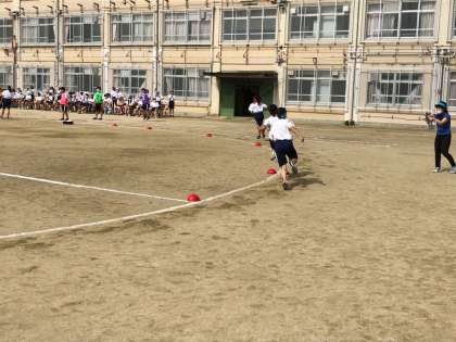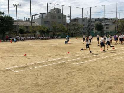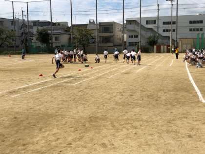 2年生最後の競技「学級対抗リレー」の様子です。向こう正面の直線コースが,オーバーテイクポイントです。