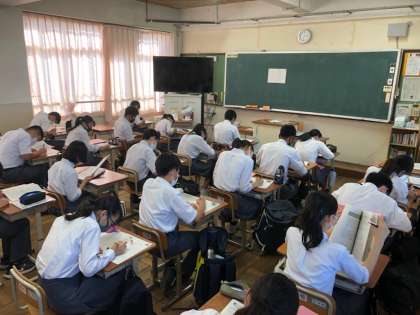 道徳の授業の様子です。1・2年は,学年教員がローテーションで授業をしました。「夢について」,「仕事へのこだわり」,「公正・公平」,「思いやり・感謝・愛情」,「自然愛護」,「生きること」など様々なテーマで学習しました。3年生は今までの道徳の授業の振り返りをしました。