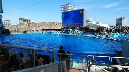 名古屋港水族館のイルカパフォーマンスが観覧できる北館3Fスタジアムの様子です。その他にも,時間指定で様々なショーが見られます。館内の観覧とともに計画的に行動し,楽しんでください。ここでは,お土産も買えます。