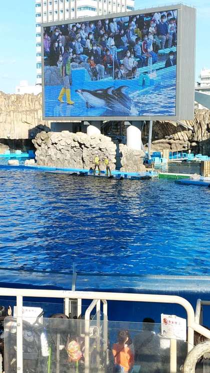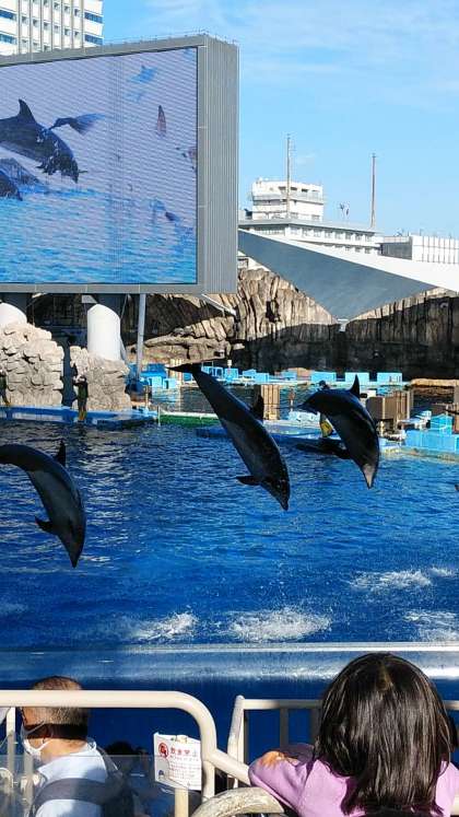 イルカパフォーマンスの様子です。先ほどのシャチほどの迫力はないかもしれませんが,スピーディなパフォーマンスと3頭のイルカのコンビネーションが見所です。