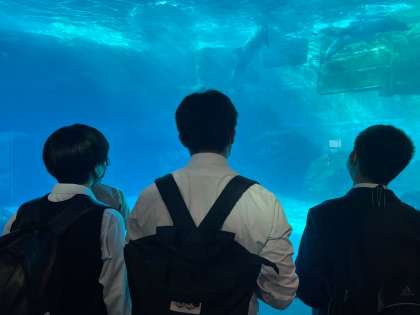 館内の様子です。グループで行動しています。二頭のシャチが,並んで泳いでいます。
