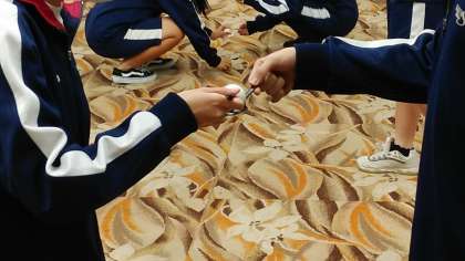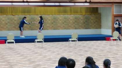 引き続き、ピン球スプーンリレー。器用さも必要です。そういえば,先日,3年生のある先生が,「ピン球,ありませんか?」とおっしゃっていました。これに使うためだったんですね。