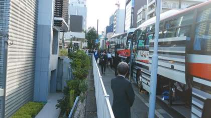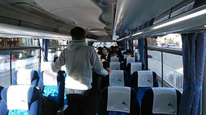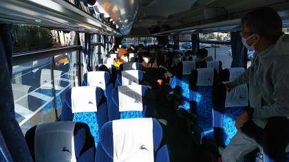 バス車内の様子です。大きな荷物は,バスのトランクに入れて,活動に必要なものだけをサブバッグに入れています。しっかり荷物の仕分けは,できていますか?