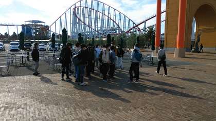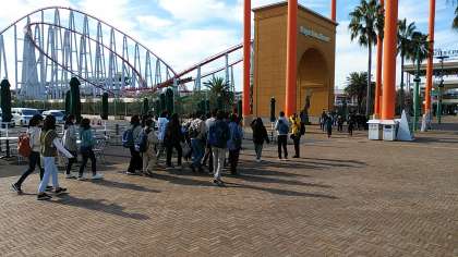 バスを降りて,入場口へ向かうところです。