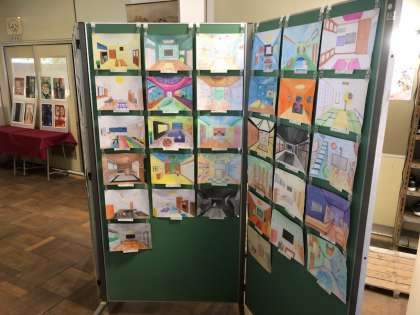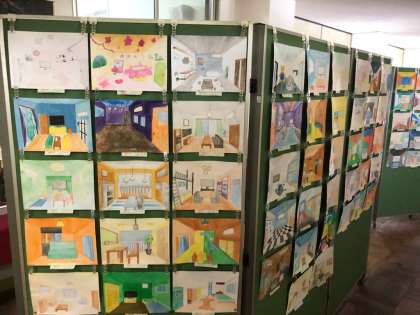 2年生の美術科の作品です。「透視図法で描く 〜自分の部屋やリビングをつくる〜」というテーマで作品を作りました。