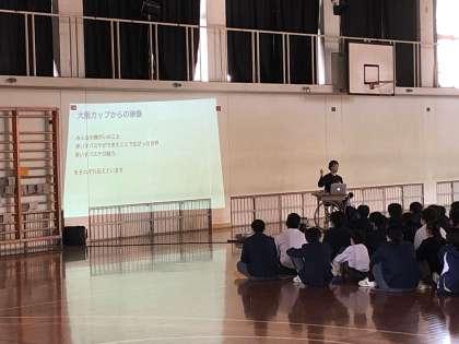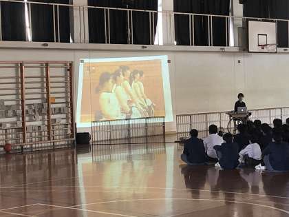 車いすバスケットボールを通して世界中に友達ができたこと,やらずに後悔するよりチャレンジすることが大切であることなど,車いすバスケットボールを続けてきたことで,経験できたこと,学んだことなど,生徒に伝わるように丁寧にお話ししていただきました。