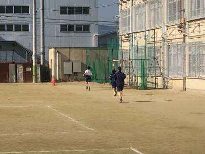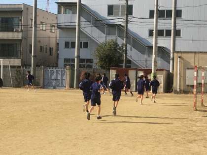 保健体育の授業の様子です。冬場のこの時期は,全学年持久走です。自分なりに設定したペースで走っています。仲間とペアになって,走っていないときは,記録を取りながら,ペアを組んでいる仲間にアドバイスをしながら,励ましの言葉をかけています。