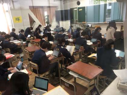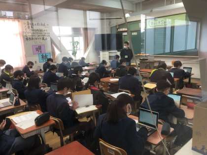 1年生道徳の授業の様子です。1年間の道徳の振り返りをしています。GIGA端末を使って,学習を進めています。映像を見たり,ワークシートを整理したり,クラスメートとの意見交流をしたりしています。