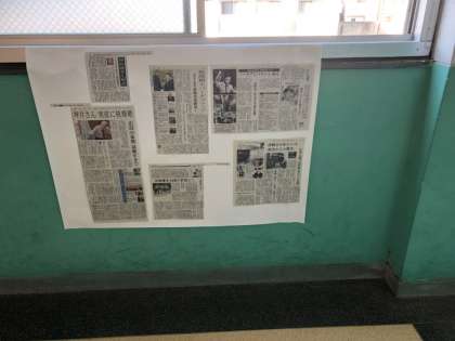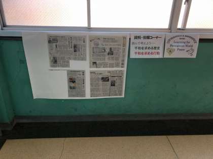 廊下に平和に関する資料を掲示しています。