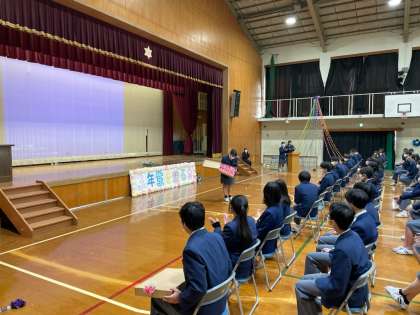 3年生が卒業式で付けるコサージュの贈呈です。3年生の前でお披露目をしました。
