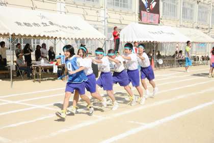 まずは1年生の学年種目「ムカデリレー」。いちに!いちに!いちに!転ぶ姿も見られましたが、観客から「速いなぁ!」と驚きの声も出るほどリズムよく力を合わせて走っていました。