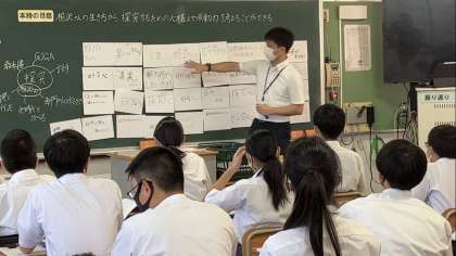 本日6時間目に2年4組で道徳の校内研修を行いました。その時の様子です。授業後の職員の研究協議の様子も載せています。