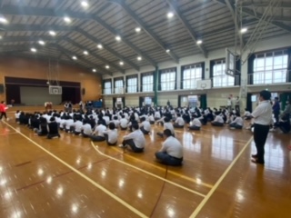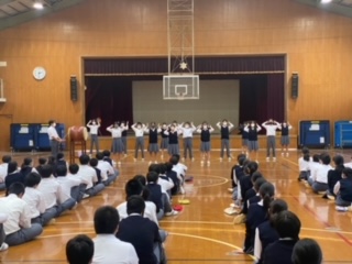 体育大会に向けて、1年生から3年生までの赤団が体育館に集まり団長を中心に結団式が行われました。そのときの様子です。