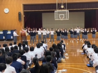 体育大会に向けて1年生から3年生までの青団が集まり、団長を中心に結団式が行われました。そのときの様子です。